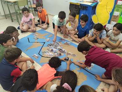En primer lugar, el alumnado comprobó, por grupos cooperativos, sus conocimientos sobre geografía, uniendo las imágenes con los nombres de los países.